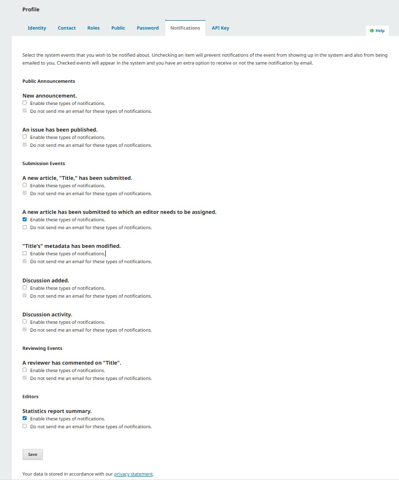 1.  Misalnya : Anda login sebagai editor yang dibutuhkan untuk notifikasi hanya >> A new article has been submitted to which an editor needs to be assigned. dan Statistics report summary. Sementara yang lainnya tidak diperlukan. Maka seperti gambar dibawah ini caranya: