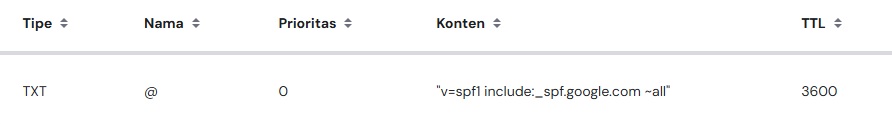 Catatan SPF (Sender Policy Framework) membantu memverifikasi keabsahan email yang dikirim dari domain Anda. Tambahkan catatan TXT berikut:
